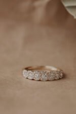 “Elegant 18k Gold Moissanite Diamond 7 Moissanite Diamonds Halo Band – a beautiful band featuring seven Moissanite diamonds in a halo setting, perfect for a timeless, sophisticated style.”