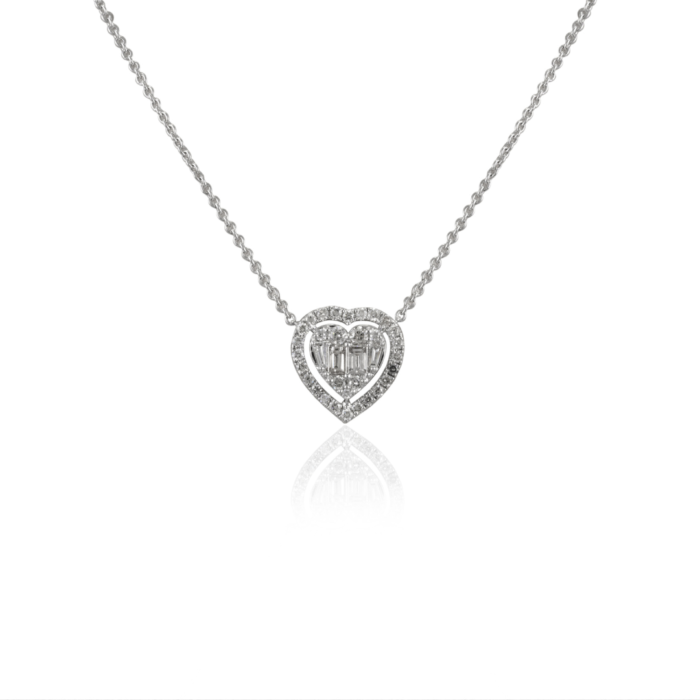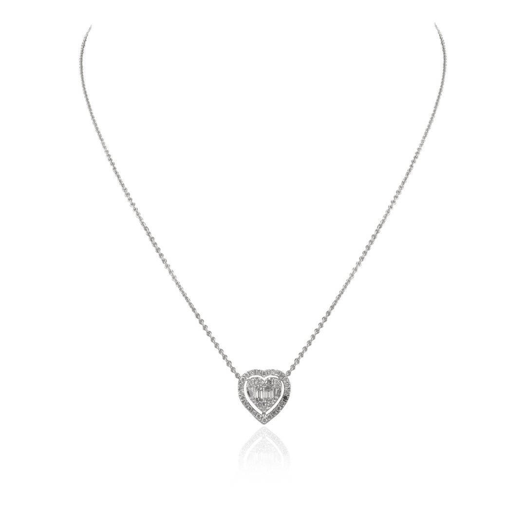 The 18k Gold Natural Diamond Heart Necklace features 0.5 carats of diamonds set in 18k solid white gold. With a gross weight of 3.22 grams and an illusion setting.