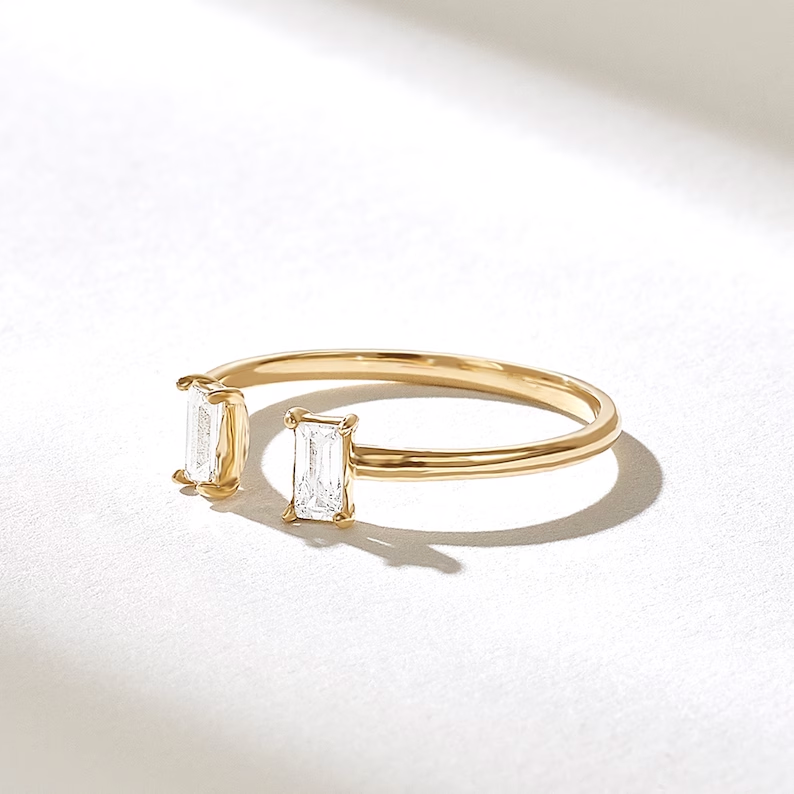 Showcasing natural diamonds with GH color and VS-SI clarity, this ring holds a total carat weight of 0.34 ct, each baguette cut diamond perfectly placed to maximize brilliance. The diamonds’ sleek linear formation complements the open cuff design, creating a refined yet striking look.