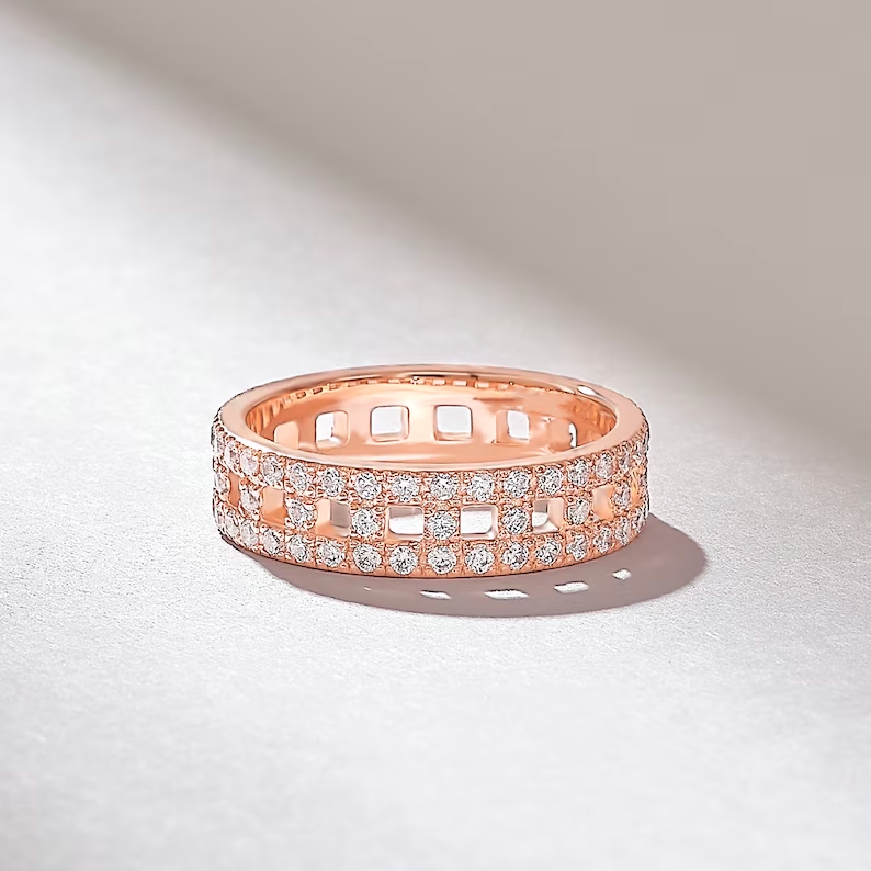 Whether as a wedding band or a statement piece, the 18k open squares pave wedding band is a sophisticated addition to any jewelry collection, perfect for celebrating love and commitment in a contemporary way.