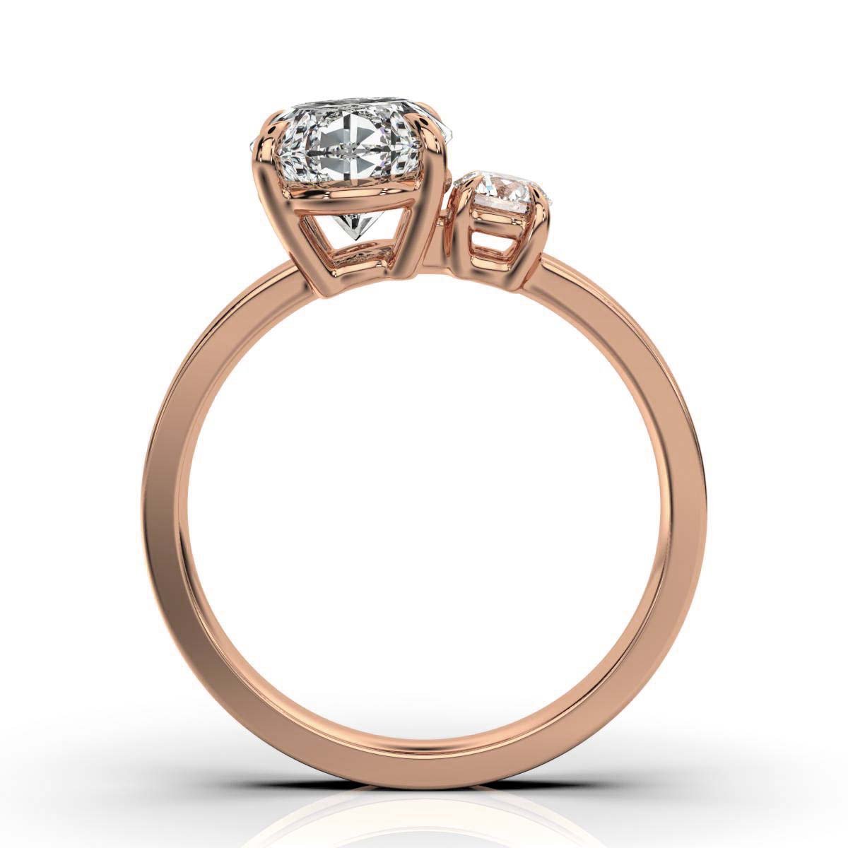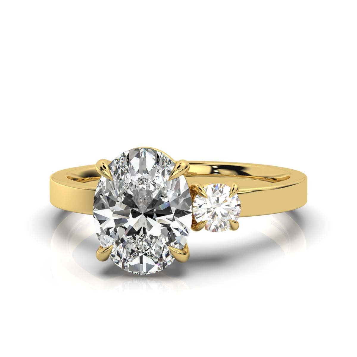 A 2.2ct oval Moissanite solitaire ring with a round side stone, set in 18k solid gold. A dazzling, elegant, and timeless choice.