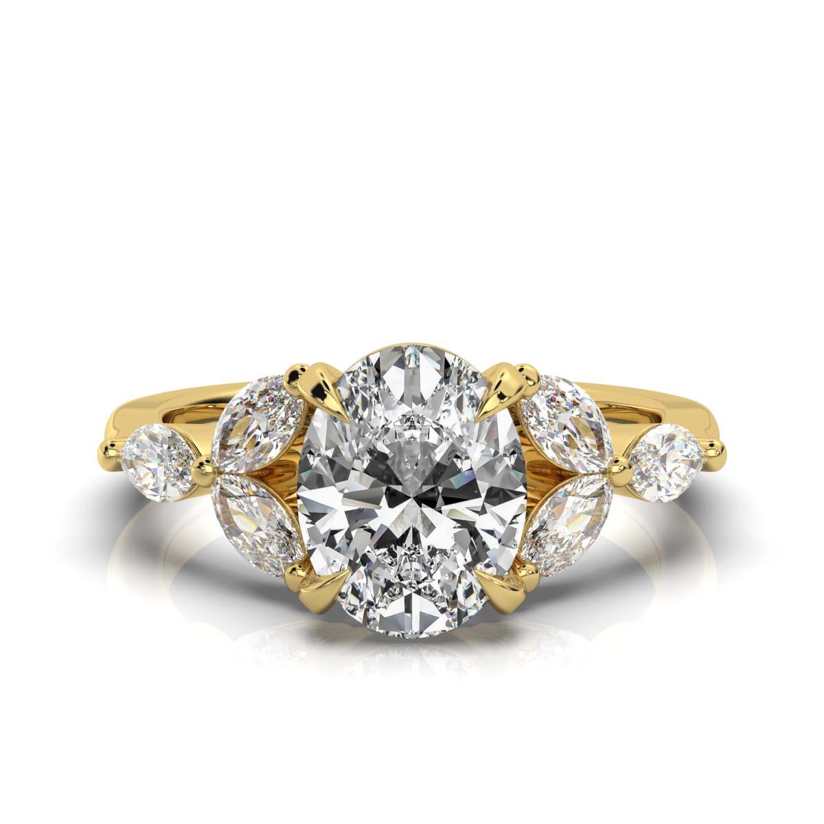 Elegant 2.6ct oval Moissanite engagement ring in 18k solid gold. Features a 2ct oval Moissanite with marquise-cut side stones for a timeless, refined look.