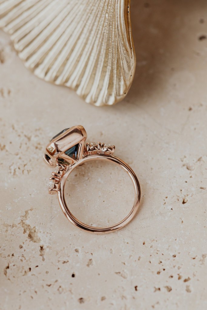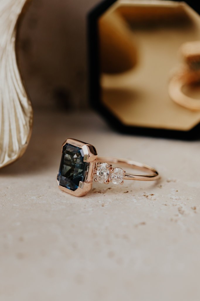 A stunning 18k solid gold ring featuring a 6.52 ct emerald-cut teal sapphire, offering a unique and elegant design that showcases the beauty of the gemstone.