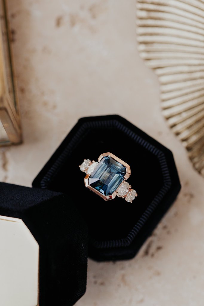 - Central Stone: 6.52 ct Emerald Cut Teal Sapphire
