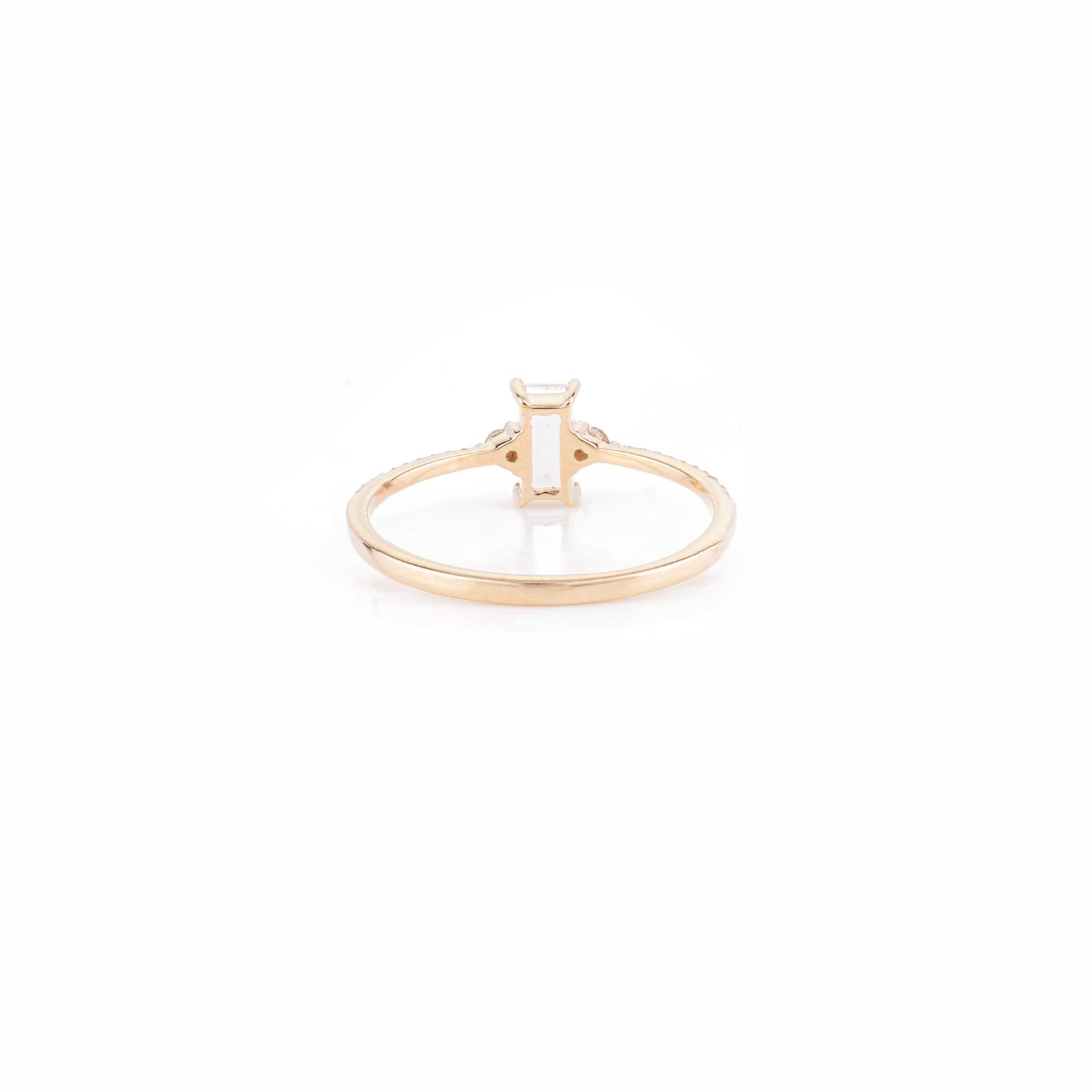 The 18k Solid Gold Baguette Cut Moonstone Statement Ring is a striking piece that combines the ethereal beauty of a rainbow moonstone with the timeless elegance of diamonds. Crafted from 18k solid gold, this ring features a captivating baguette-cut rainbow moonstone, weighing 0.36 carats and measuring 5.97 x 3.01 mm. The moonstone’s unique play of colors is beautifully highlighted by the warm tones of the yellow gold, creating a mesmerizing and elegant look.