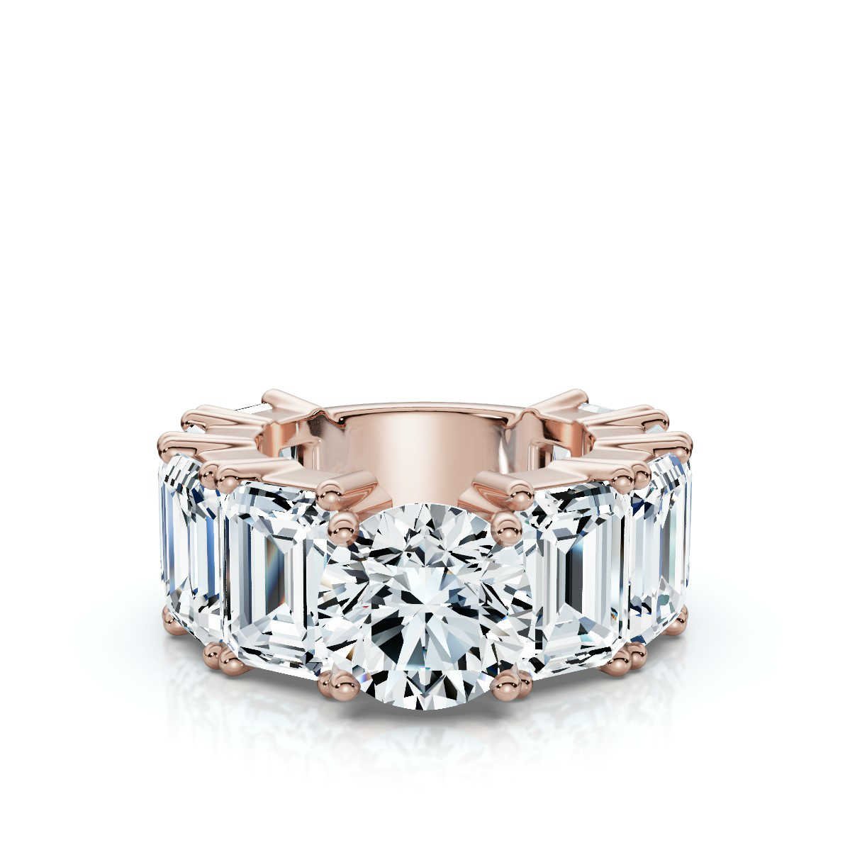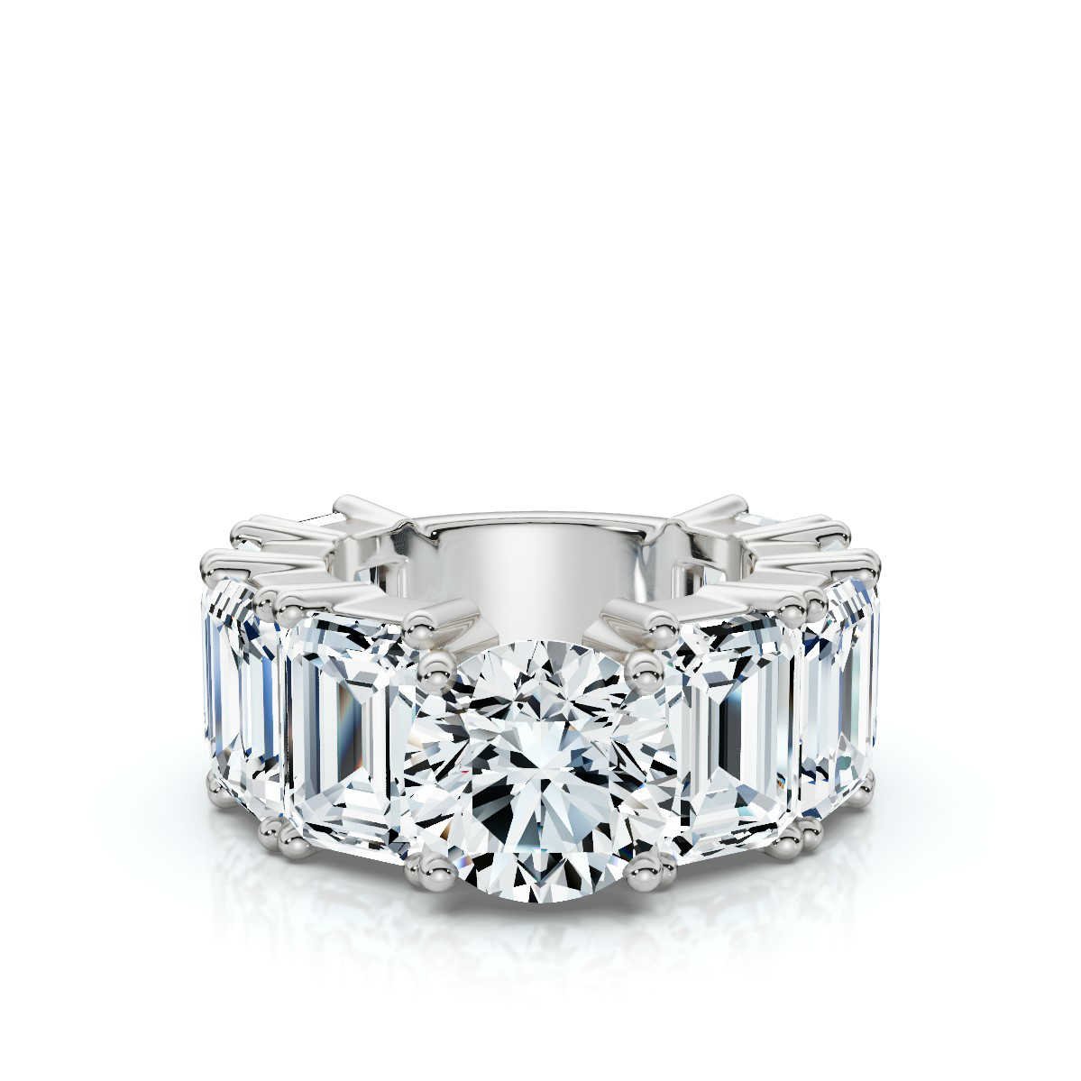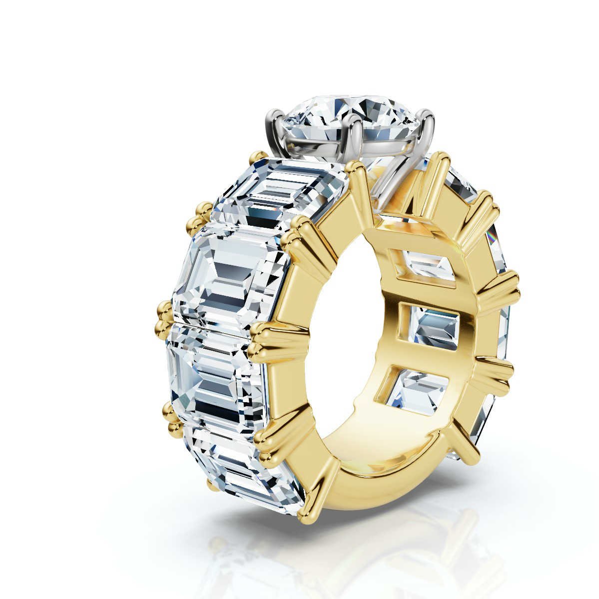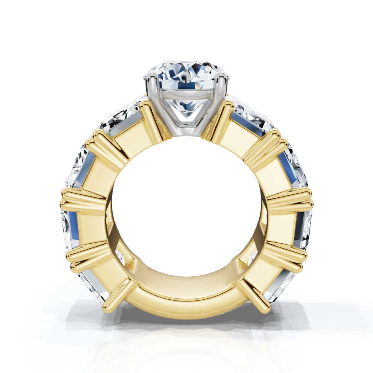 The centerpiece is complemented by eight emerald-cut Moissanite side stones, collectively weighing 16 carats, which add an extra layer of luxury and elegance to this engagement ring. The wide 8 mm comfort-fit band, crafted in 18k solid gold, is available in white, rose, and yellow gold, allowing for a personalized touch. The ring is meticulously crafted without rhodium plating to maintain the natural richness of the gold.