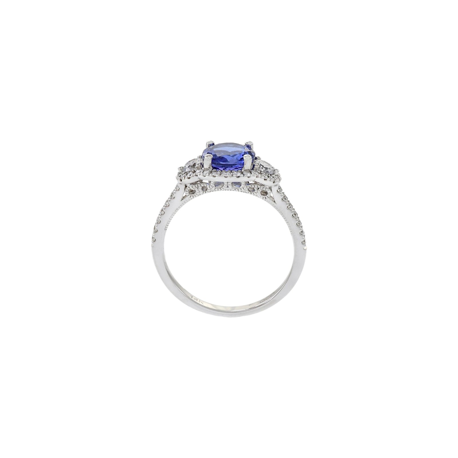 Enhancing the center stone are 0.54 carats total weight of sparkling diamonds. These diamonds are artfully set to maximize sparkle, perfectly complementing the tanzanite and bringing out the allure of the ring. It creates an effect that grabs attention from all sides.