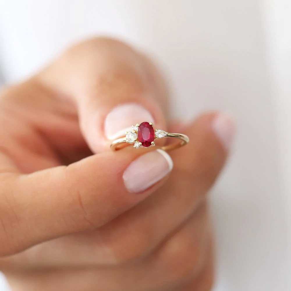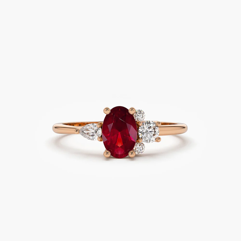 Timeless elegance meets vibrant luxury in the 18k Solid Gold Diamond and Oval Ruby Ring this exquisite ring features a stunning oval-cut ruby (6×4 mm) as its centerpiece, radiating deep red hues that symbolize passion and love. Accentuating its brilliance are pear and round-cut diamonds (0.19 CTW, G color, SI clarity), creating a dazzling contrast that enhances its overall allure.