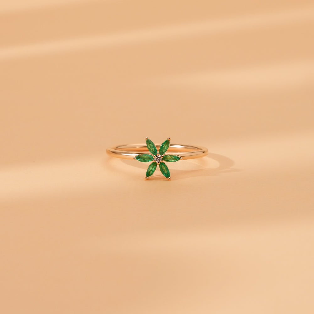 Evoke elegance and natural beauty with this 18k Solid Gold Emerald and Natural Diamond Flower Ring—a graceful fusion of botanical charm and fine craftsmanship. Featuring a vivid cluster of lush natural emeralds totaling 0.23 carats, this ring is artfully arranged into a delicate flower silhouette, symbolizing growth, love, and renewal. At the heart of the floral design rests a brilliant natural diamond (0.01 ctw), subtly enhancing the piece with a touch of sparkle. Whether worn as a statement piece or part of a layered stack, this ring is perfect for anyone drawn to romantic, garden-inspired designs.