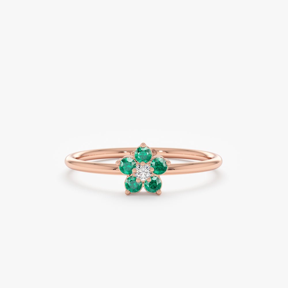 18K Solid Gold Emerald and Natural Diamond Flower Ring