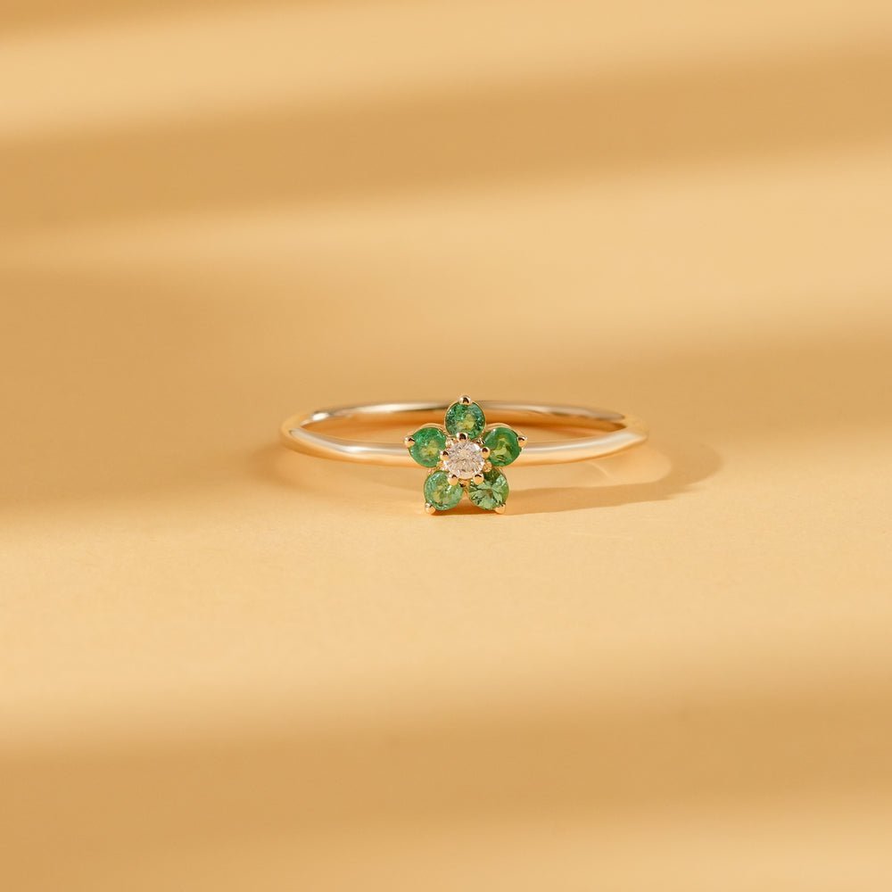 Delicate and full of charm, our 18k Solid Gold Emerald and Natural Diamond Flower Ring captures the beauty of nature in a timeless fine jewelry design. At the heart of this elegant piece lies a floral motif crafted with vibrant natural emeralds and accented by brilliant natural diamonds, forming a stunning 6mm flower centerpiece. The lush green hue of 0.18 carats of emeralds is complemented by the subtle sparkle of 0.03 carats of G-H color, VS-SI clarity diamonds, offering a look that is both fresh and sophisticated.