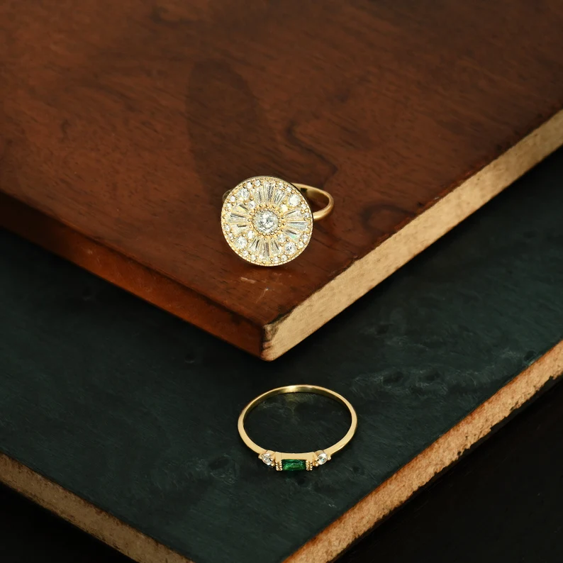 Sleek 18k solid gold band ring featuring baguette-cut emeralds—crafted for modern elegance, vibrant color, and timeless sophistication.