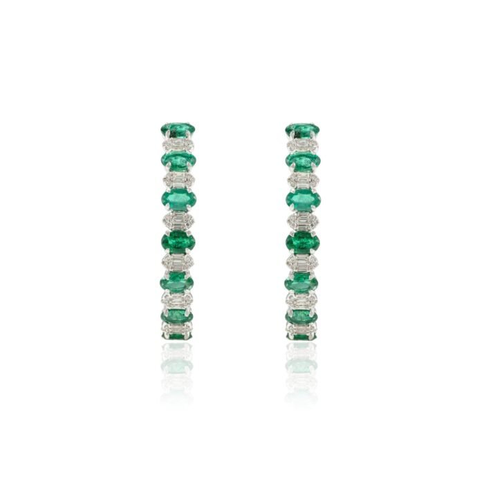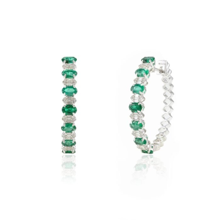 The 18k Solid Gold Emerald & Diamond Designer Hoops are a stunning addition to any jewelry collection, combining the vibrant allure of emeralds with the timeless elegance of diamonds. Crafted from 18k solid gold, these hoops feature exquisite oval-shaped emeralds, each measuring 4.8 x 3.10 mm, with a total gemstone weight of 3.08 carats. The rich green hue of the emeralds is beautifully complemented by the cool tones of the white gold, creating a harmonious and captivating look.