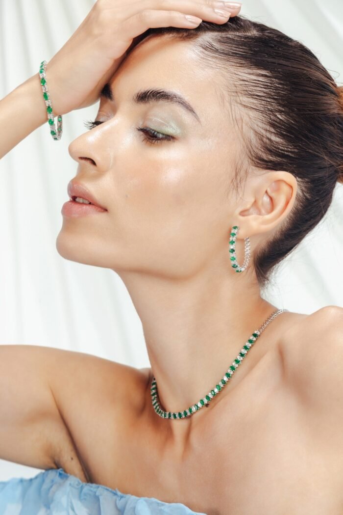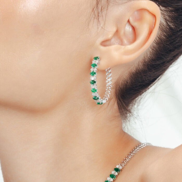 Weighing 9.65 grams, these designer hoops offer a substantial yet comfortable feel, making them ideal for everyday wear or special occasions. Measuring 34.27 mm in length and 4.65 mm in width, the hoops are designed to sit elegantly on the ears, adding a touch of luxury to any outfit. The elegant design ensures that the emeralds and diamonds remain the focal points, allowing their beauty to shine through.