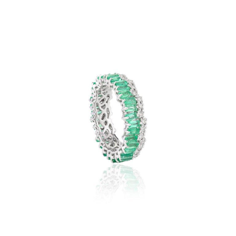 Crafted from high-quality 18k solid gold, this eternity band features a stunning combination of emeralds and diamonds. The band is adorned with baguette-cut emeralds totaling 1.83 carats, each emerald carefully set to create a seamless and continuous design. Accompanying the emeralds are diamonds weighing 0.495 carats, adding a touch of brilliance and sparkle to the band.