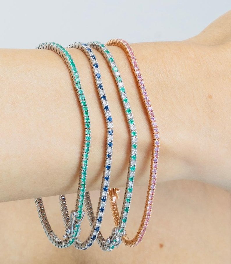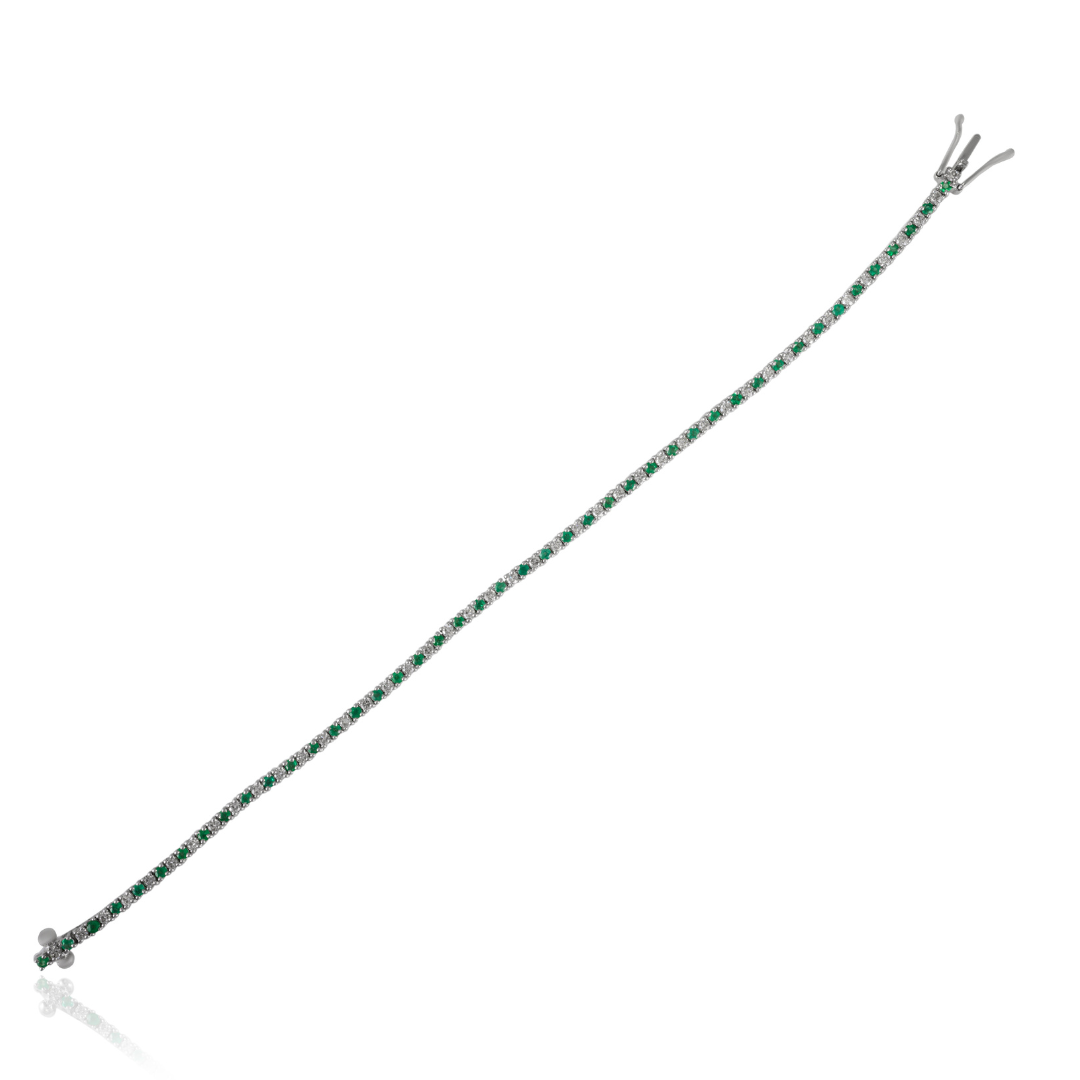 Complementing the emeralds are dazzling diamonds, each also measuring 2.2 mm, contributing to a total diamond weight that enhances the overall brilliance of the bracelet. The prong setting ensures that both the emeralds and diamonds remain securely in place while allowing maximum light to pass through, enhancing their natural sparkle.