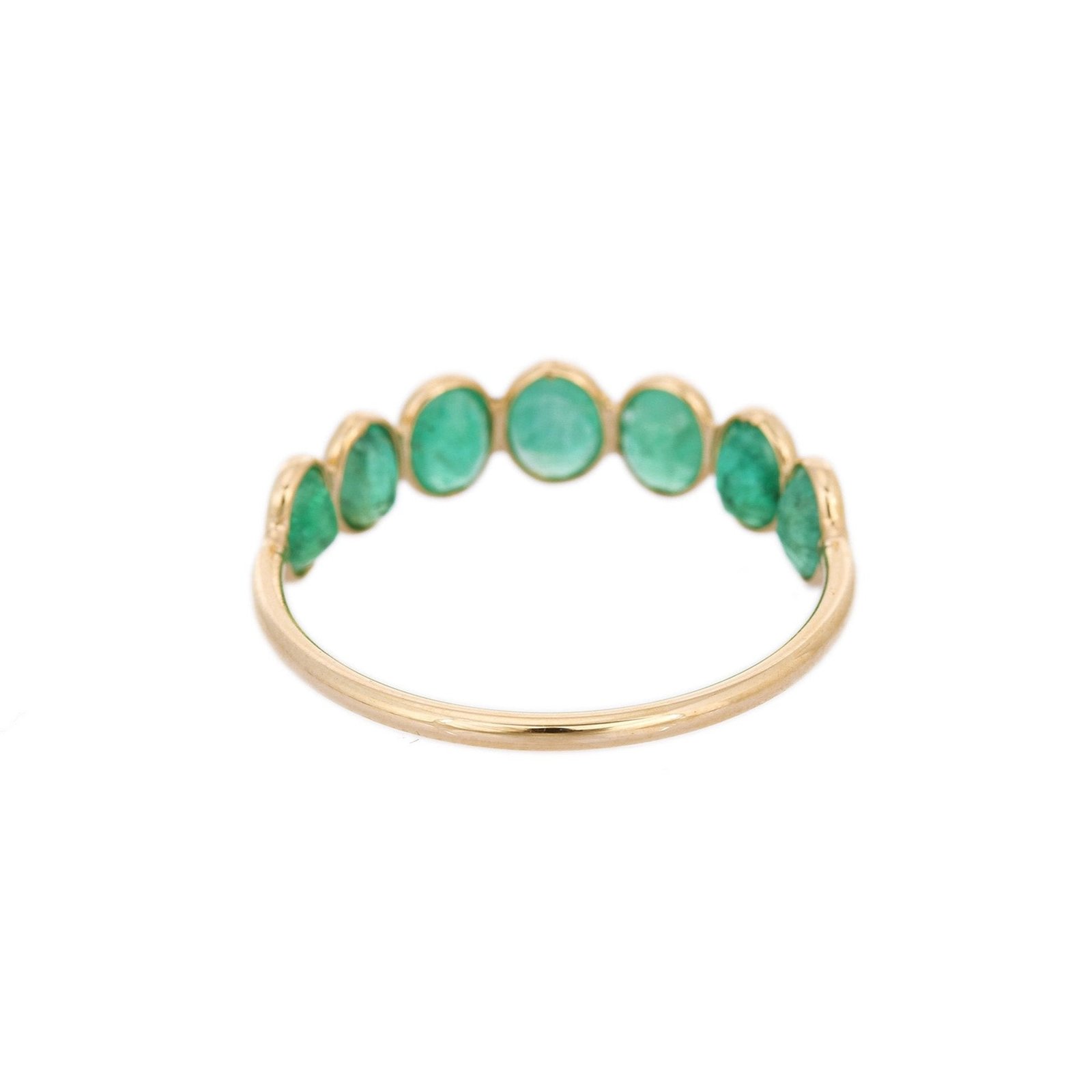 Crafted from 18k Solid Gold, this half eternity band features 7 oval-cut emeralds, each measuring 4 x 3 mm and totaling 1.55 carats. The emeralds are carefully selected for their vibrant green color and clarity, set in a secure bezel setting that enhances their natural brilliance and ensures durability.