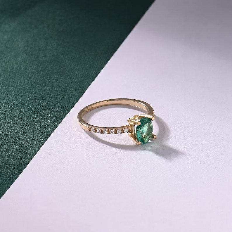 Elegant 18k solid gold emerald oval solitaire ring, combining vibrant green emerald with a classic solitaire setting for a sophisticated and lasting statement.