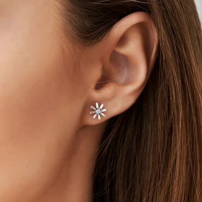 “Elegant 18k Solid Gold Floral Design Baguette Moissanite Diamond Stud Earrings – a stunning floral pattern with baguette Moissanite diamonds, perfect for adding a radiant touch.”