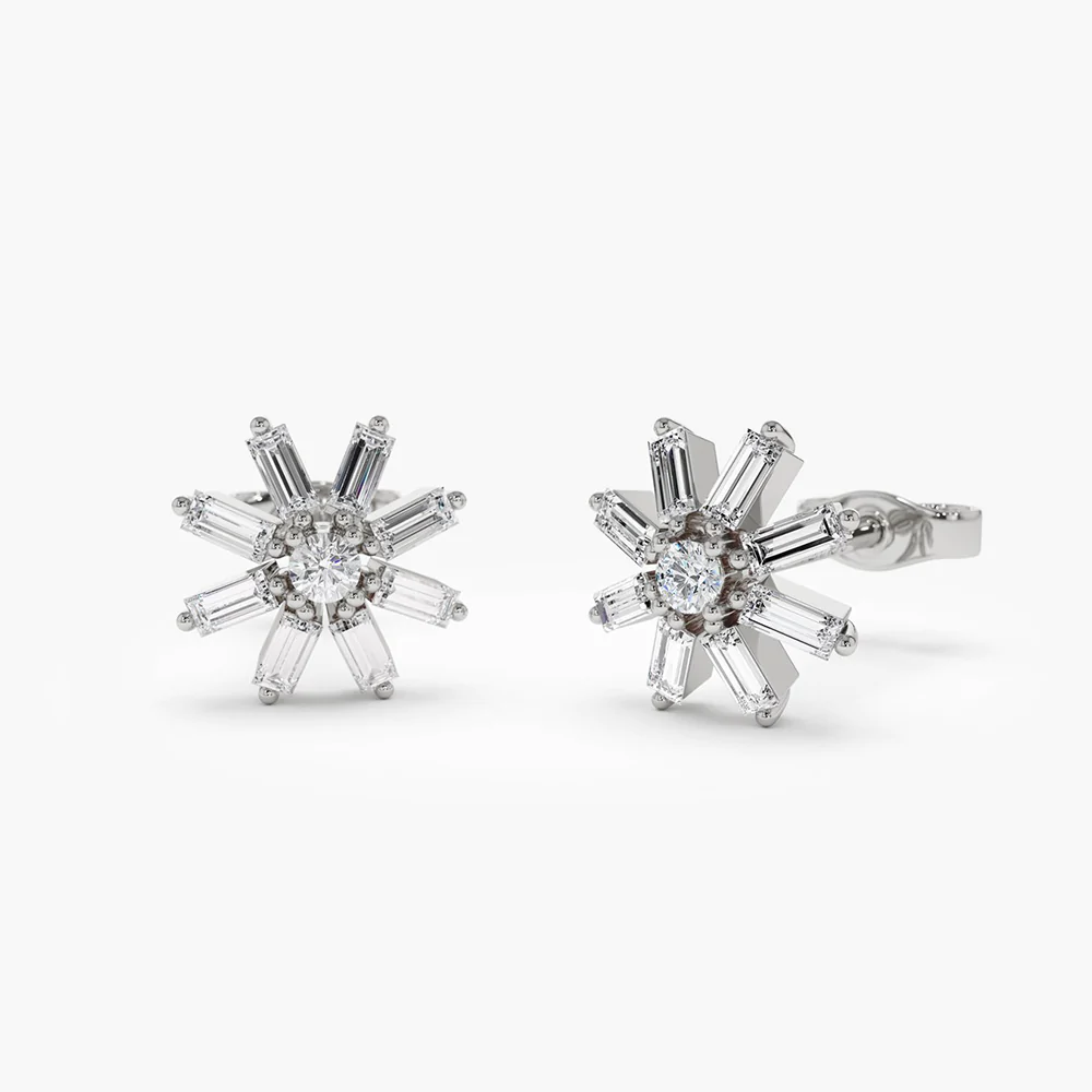 18k Solid Gold Floral Design Baguette Moissanite Diamond Stud Earrings
