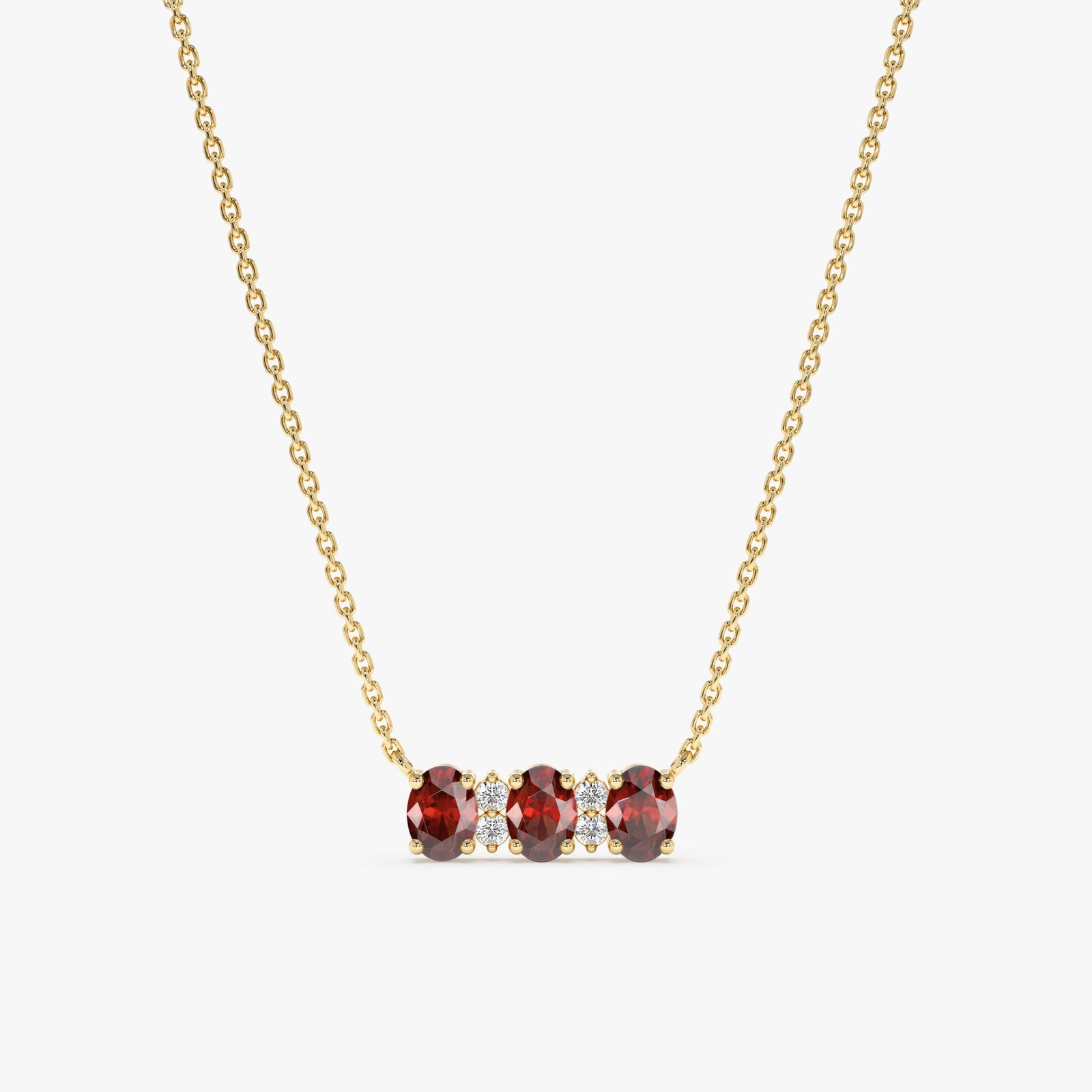 At the center of this necklace are three breathtaking oval-shaped natural garnet gemstones, each carefully selected for its deep red hue and exceptional clarity. The vibrant red color of the garnets symbolizes love, passion, and prosperity, making them a meaningful addition to any jewelry collection. The oval shape of the gemstones adds a touch of classic elegance and sophistication to the design, creating a timeless aesthetic that is perfect for both formal occasions and everyday wear.