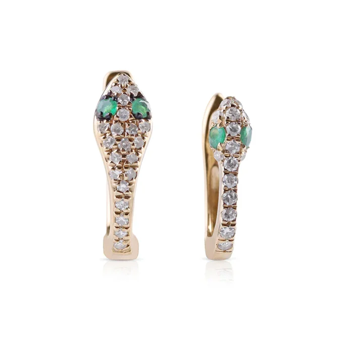 Designed from premium 18k gold, these huggies feature a special snake motif that gives it a playful touch to the jewelry collection. The interplay of sparkling diamonds and colorful emeralds creates an exquisite contrast, making this an ideal piece for casual and formal purposes.