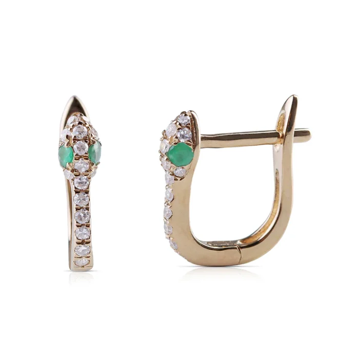 Introducing the 18k Solid Gold Mini Diamond And Emerald Snake Huggies a gorgeous set of earrings that exquisitely blend elegance with modern design.