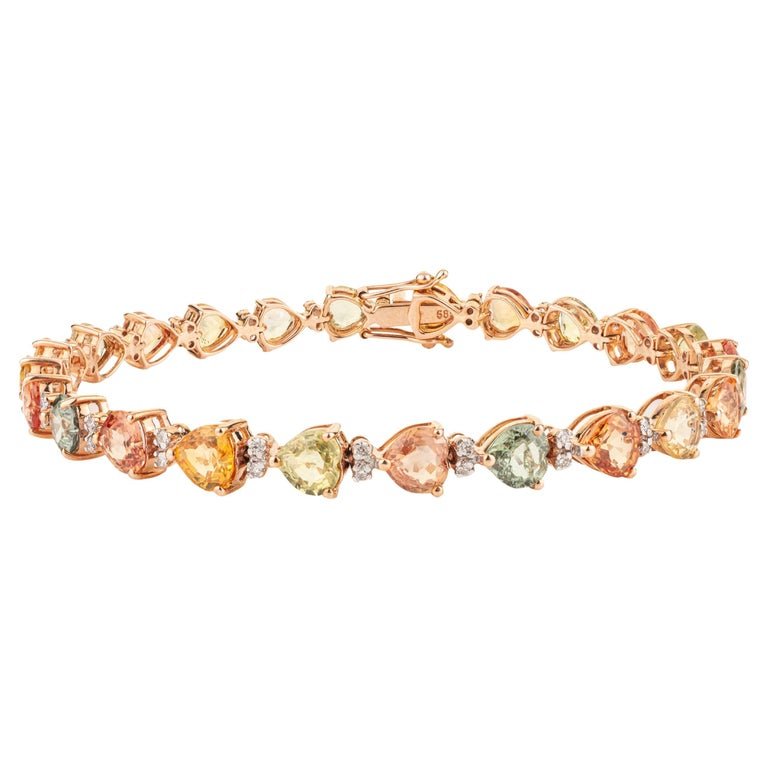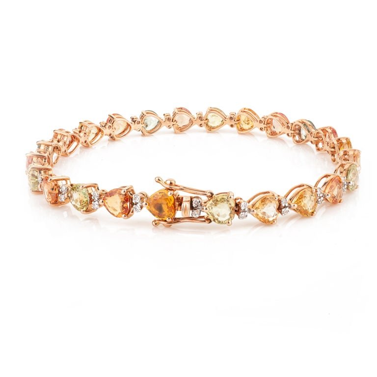 Indulge in the enchanting beauty of our 18k Solid Gold Multi Sapphire Heart Tennis Bracelet, a masterpiece of elegance and sophistication. Crafted from premium 18k solid gold, this bracelet features 24 captivating heart-shaped multi-colored sapphires, totaling an impressive 13.05 carats. Each sapphire, measuring 5 x 5 mm, exudes a spectrum of colors including deep blues, vibrant yellows, and rich pinks, creating a striking contrast against the warm tones of rose gold.