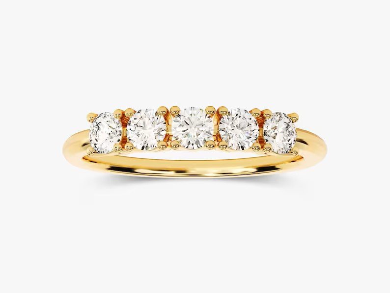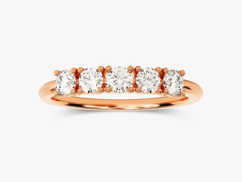 Crafted from solid 18k gold, this ring is available in White, Rose, and Yellow Gold, allowing you to choose the perfect hue to complement your style. The five-diamond setting represents milestones of a journey together, making it an ideal choice for anniversaries, weddings, or as a meaningful gift. The slim yet durable band ensures comfort while adding a touch of sophistication to any look.