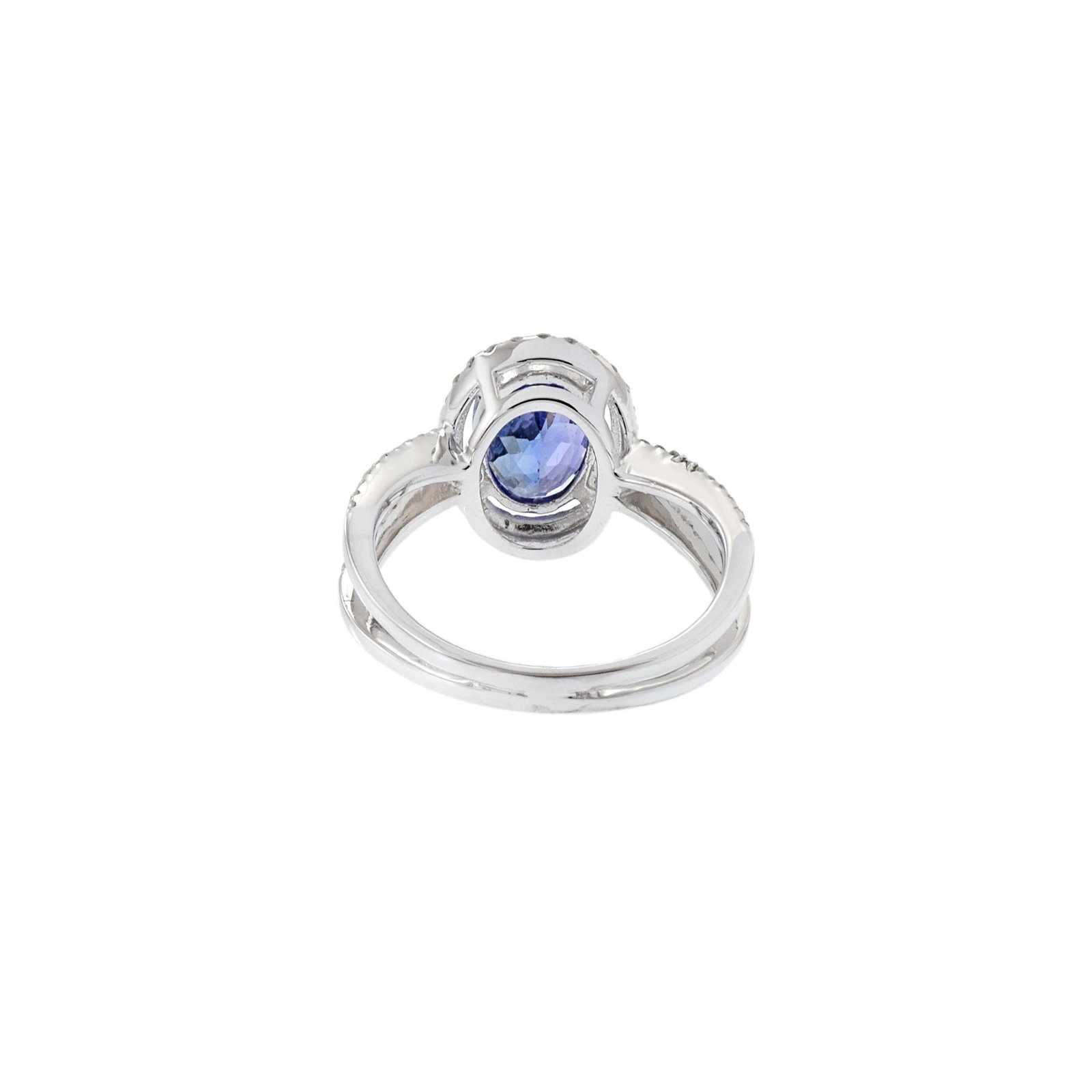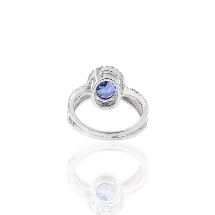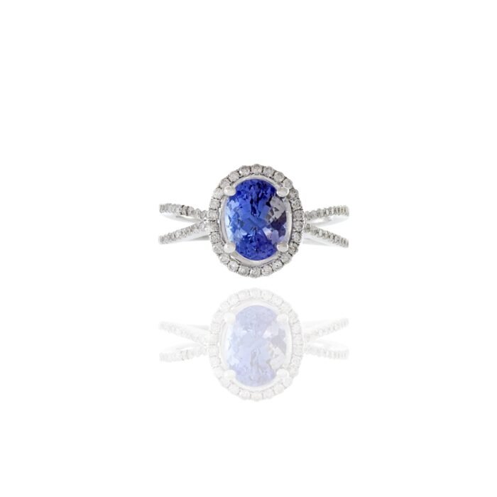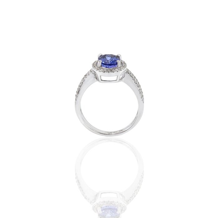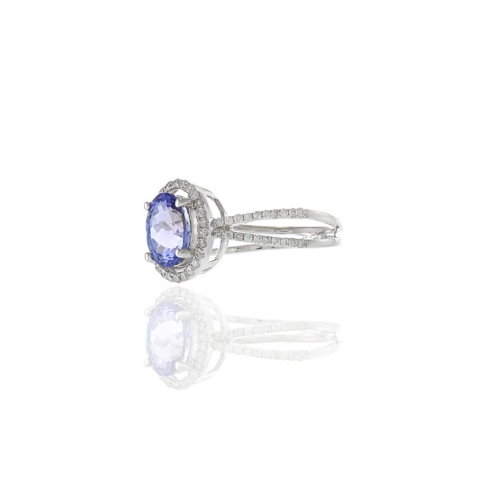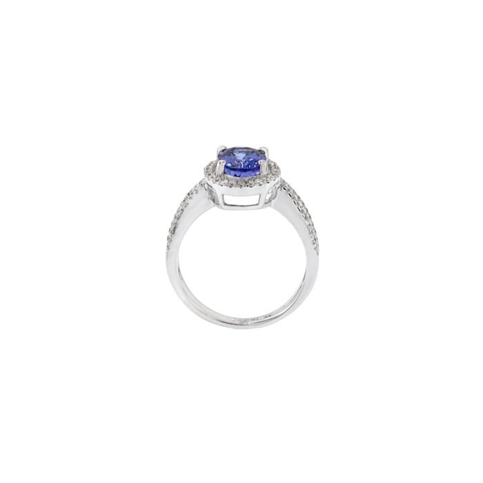 At the center of this ring is a beautiful 1.84-carat oval faceted-cut tanzanite, famous for its bright blue-violet color and excellent brilliance. The tanzanite is surrounded by a halo of 0.41 carats total weight of round-cut diamonds, creating a sparkling effect that enhances the beauty of the gemstone.