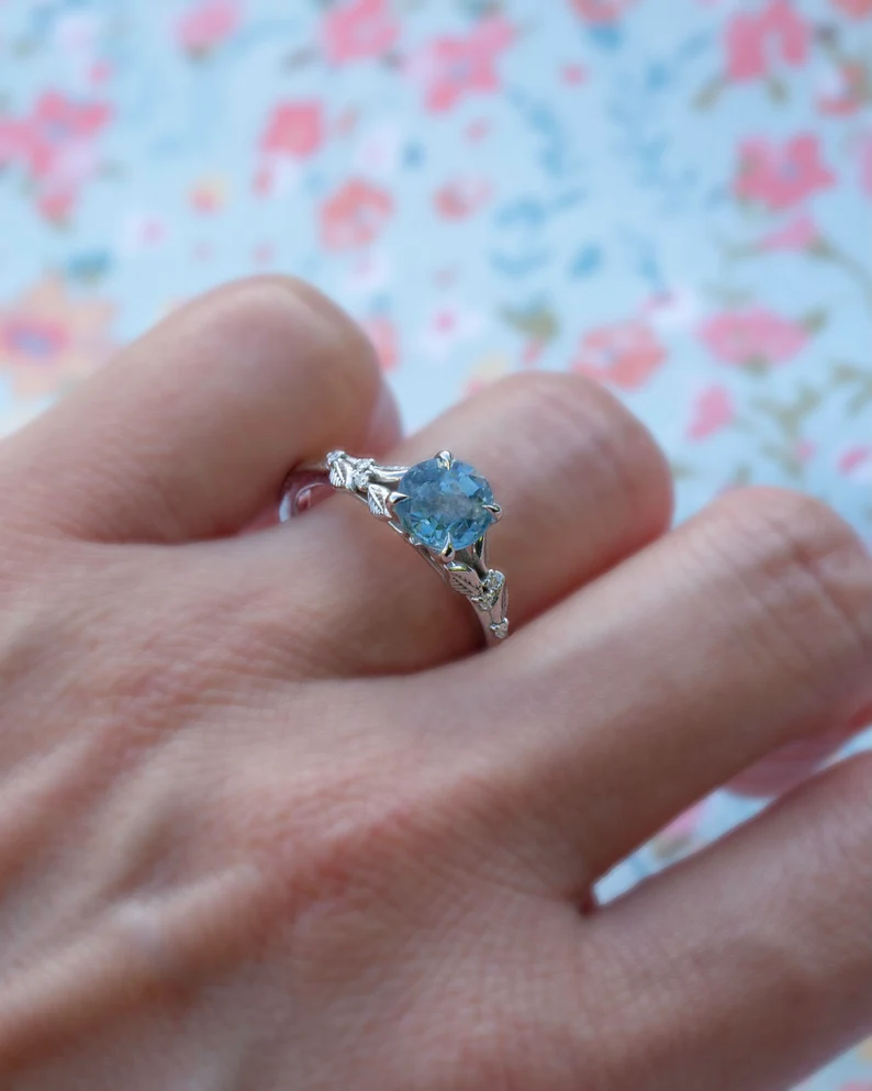 Whimsical 18k solid gold engagement ring featuring a pastel blue sapphire with delicate leaf details—crafted for natural elegance and romance.