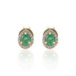 Graceful and eye-catching, these 18k solid gold stud earrings feature pear-cut emeralds framed by a sparkling diamond halo—pure timeless elegance.