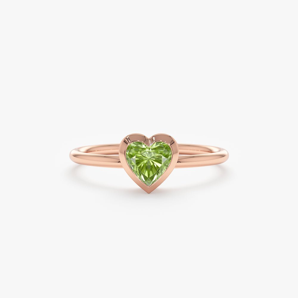 A romantic 18k solid gold ring featuring a heart-shaped peridot, offering a vibrant and elegant design perfect for any special occasion.
