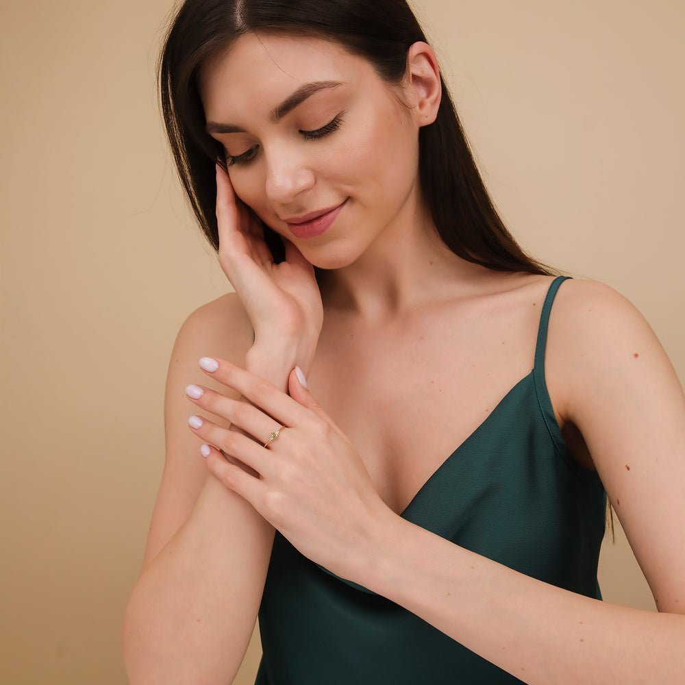 Delight in the fresh, vibrant charm of this 18k Solid Gold Petite Peridot and Natural Diamonds Engagement Ring—a perfect blend of elegance and color. Crafted from high-quality 18k solid gold, available in white, rose, or yellow gold, this ring showcases the luminous beauty of natural peridot gemstones totaling 0.21 carats, complemented by sparkling natural diamonds with a total weight of 0.05 carats. The diamonds feature impressive GH color and VS-SI clarity, adding a subtle yet dazzling brilliance to the piece.