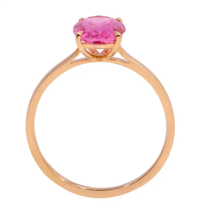 A beautiful 18k solid gold ring featuring an oval-cut pink sapphire in a prong setting, offering an elegant and timeless design perfect for any occasion.