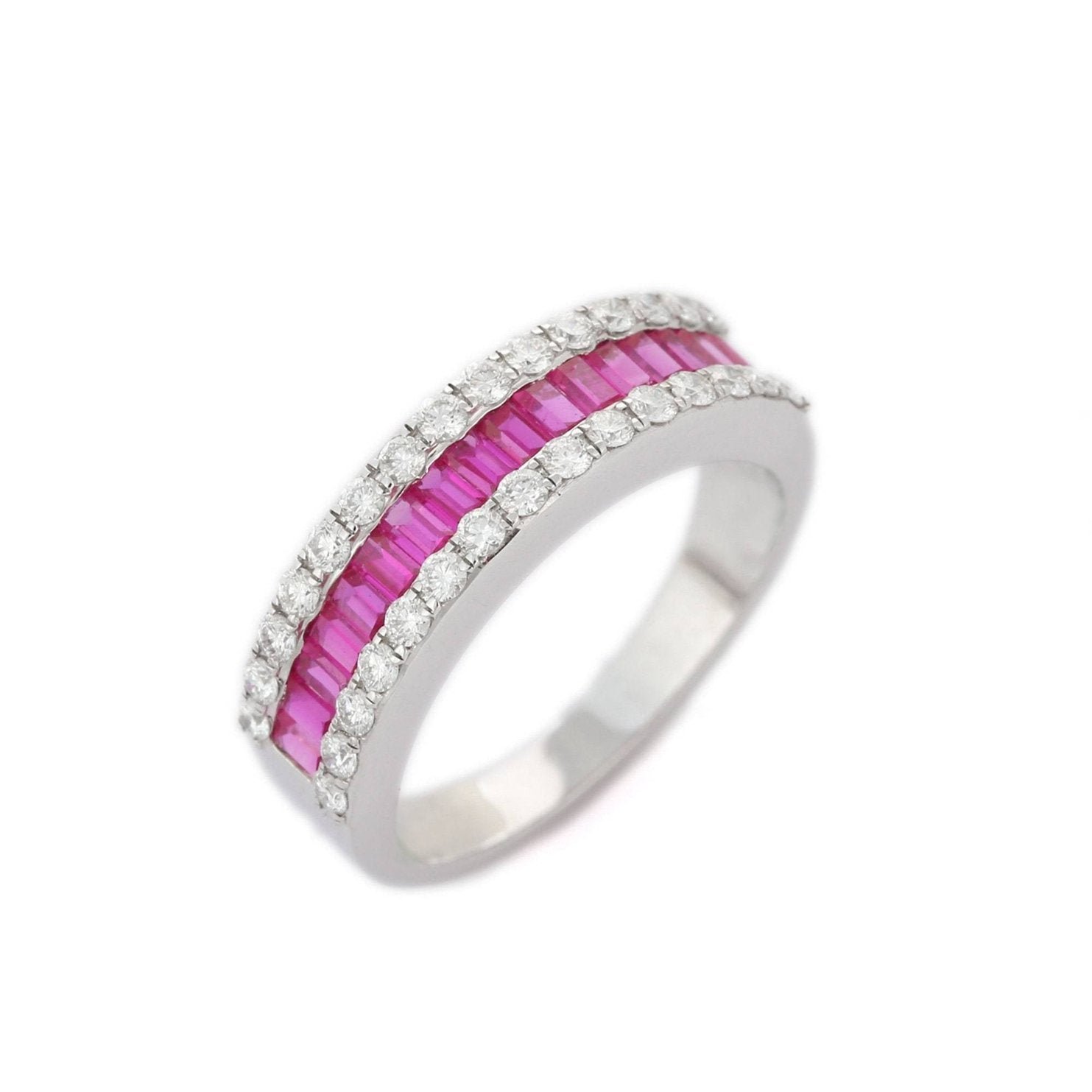 The ring is further adorned with 17 sparkling diamonds, with a combined weight of 0.46 carats. Each diamond, measuring 1.75 mm, adds a touch of sparkle and sophistication, perfectly complementing the vibrant rubies. The combination of baguette rubies and diamonds creates a harmonious design that captures the light beautifully and adds a touch of luxury to the piece.