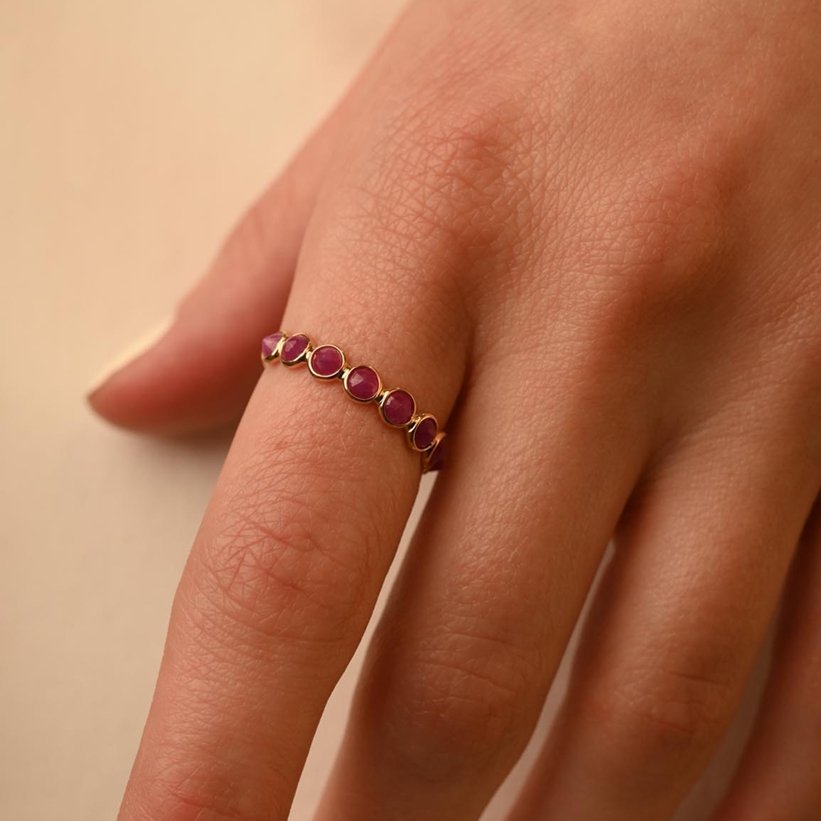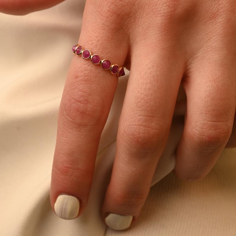 Crafted from 18k Solid Gold, the band provides a warm and luxurious setting that enhances the deep red hues of the rubies. Each gemstone is set in a bezel setting, which securely holds the stones while allowing their natural brilliance to shine. The bezel setting also contributes to a smooth and polished finish, adding to the overall elegance of the band.