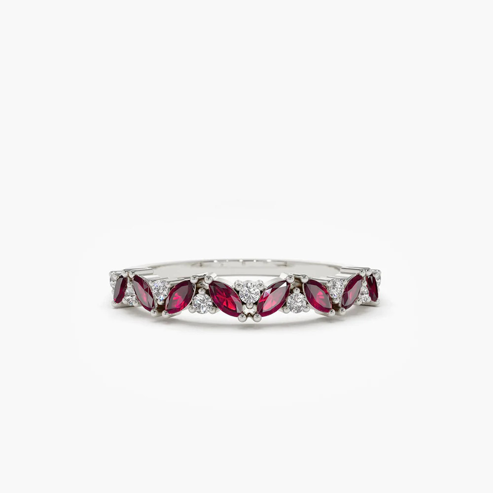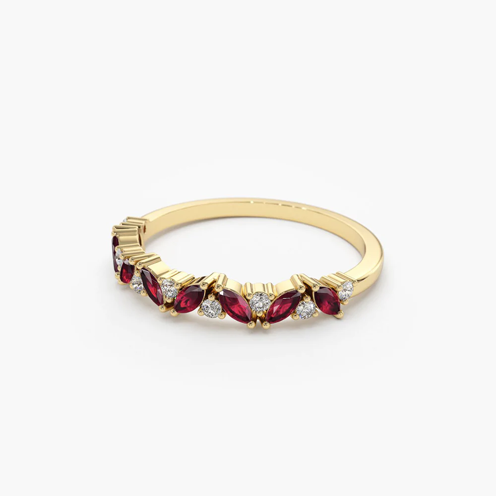 18K Solid Gold Slanted Ruby and Round Diamond Ring