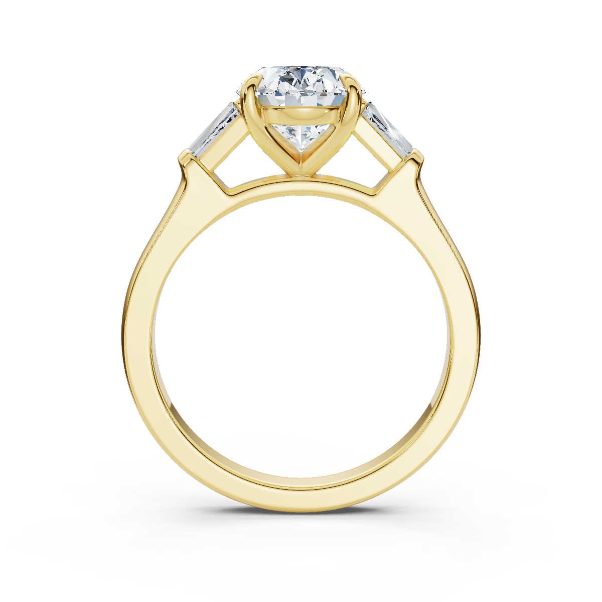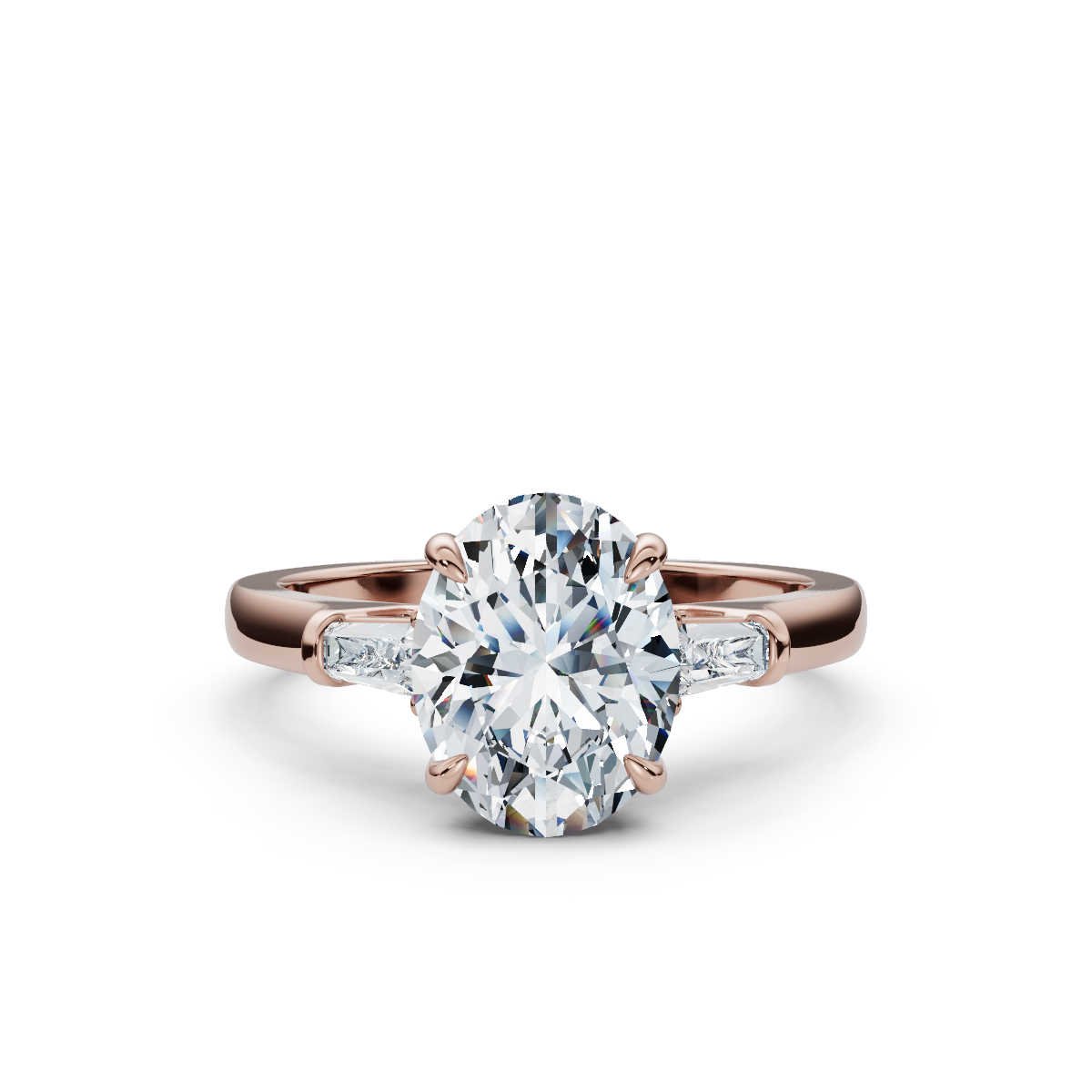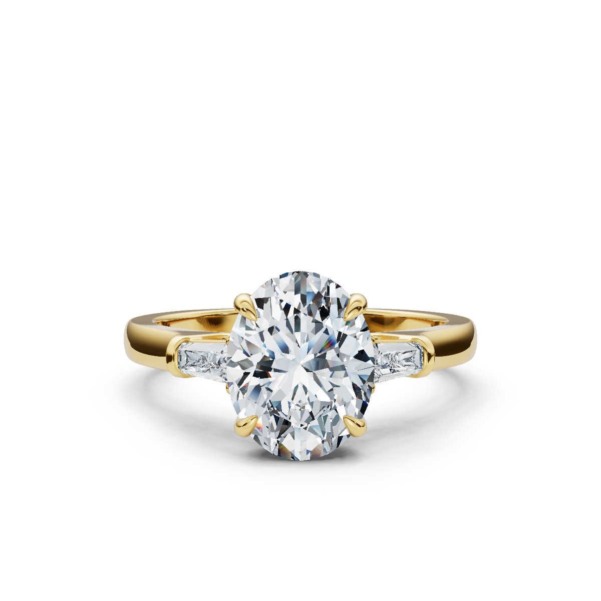 A 2ct oval lab-grown diamond surrounded by two baguette lab-grown diamonds set in a 18k solid gold three-stone design.