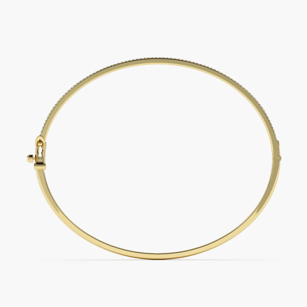Featuring a dazzling array of 162 round moissanite diamonds, each 1.0 mm in size, this bracelet radiates an enchanting sparkle with a total carat weight of 0.70 ctw. The pavé setting enhances the brilliance of the D color, VVS1 clarity diamonds, creating a seamless, shimmering surface that catches the light from every angle. With a sleek width of 2.10 mm and a height of 1.65 mm, this bangle is designed for both luxury and comfort.