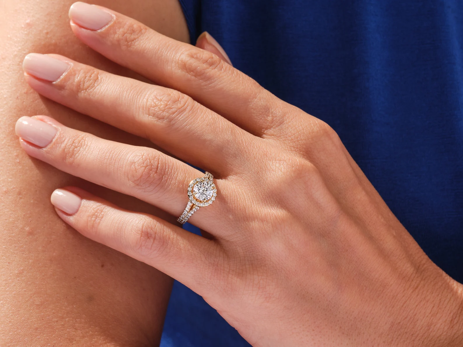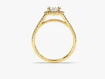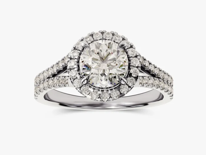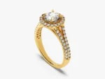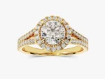 A halo of the beautifully crafted ring surrounds a round cut diamond, creating sparkle and catching her eye that’s sure to make her fall in love.