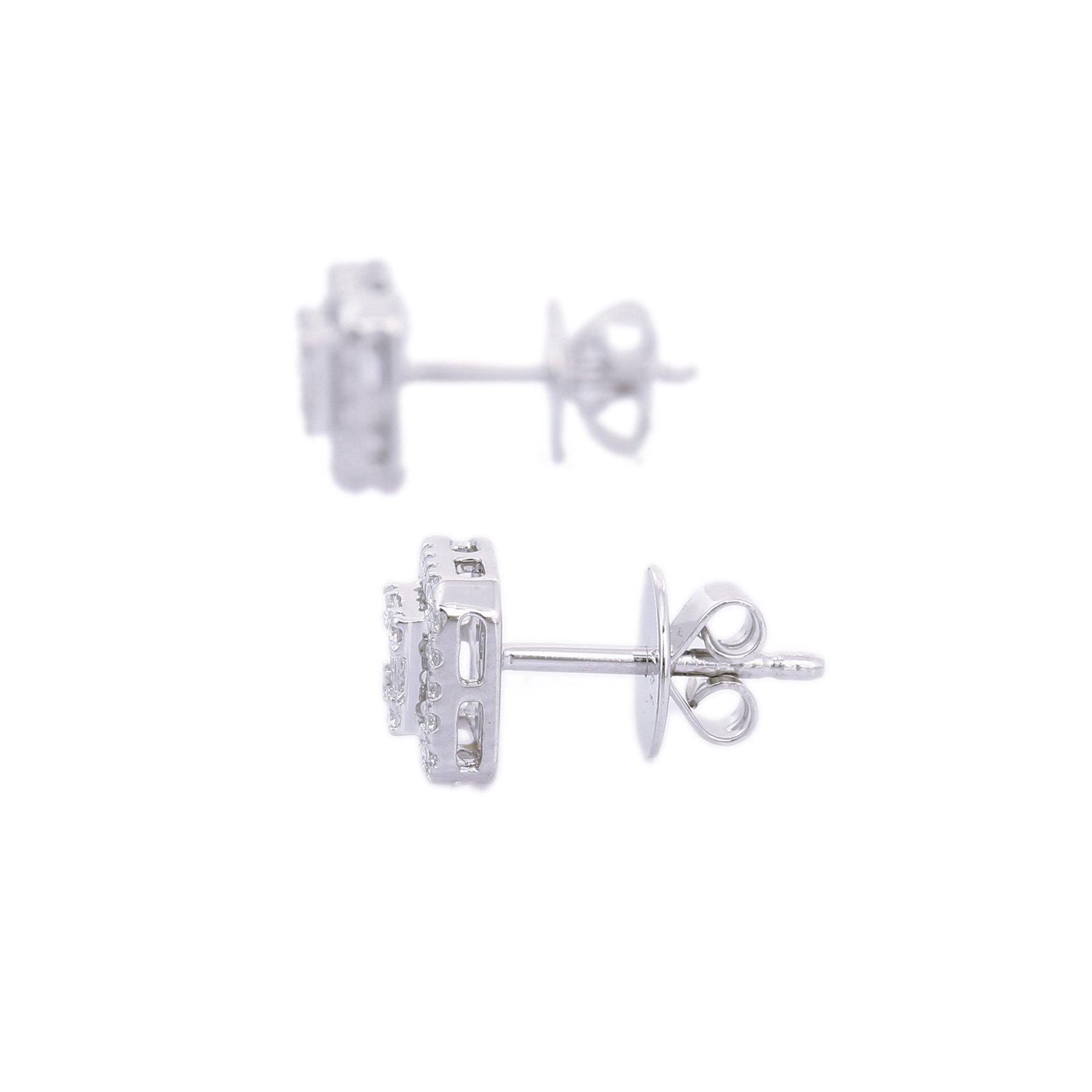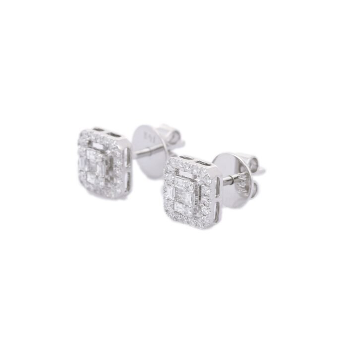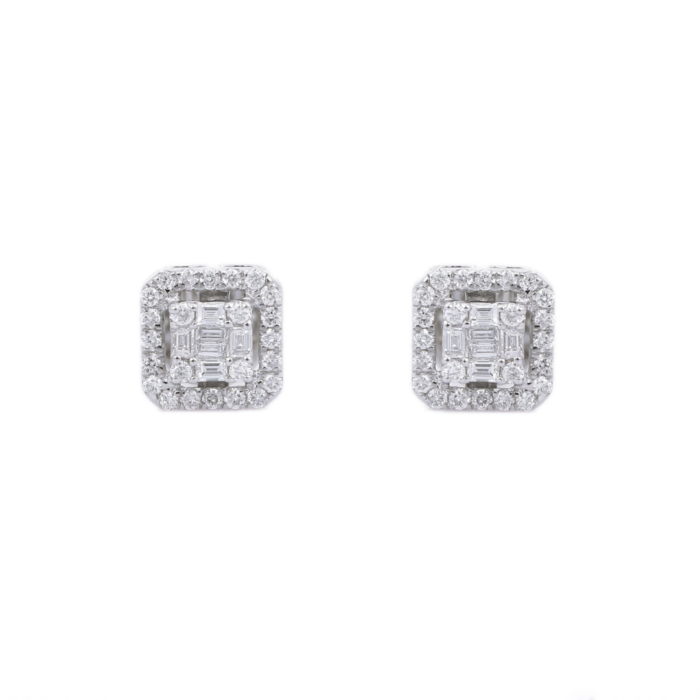 Enhance your elegance with our 18k solid white gold cluster square Natural diamond studs, featuring a combination of round and baguette diamonds. These exquisite studs, with a total weight of 2.05 grams, exude sophistication. The secure push back mechanism ensures comfort and ease of wear, making them perfect for adding sparkle to any ensemble.
