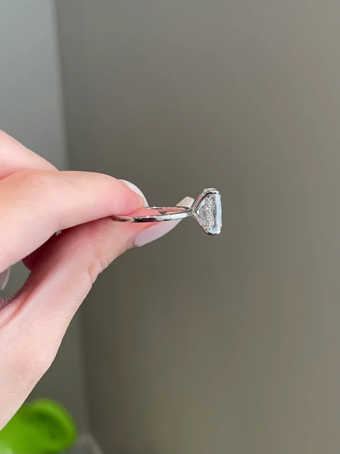 With a substantial weight of 7 carats, this moissanite stone gives off incredible brilliance and fire and clarity, a testament to love and commitment, but with a hidden halo setting that subtly enhances the brilliance and does not compromise the sleek elegance with design, allowing the radiant-cut stone to take center stage.