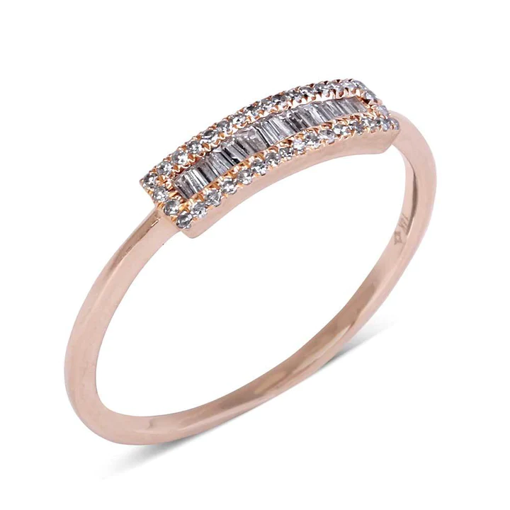 Modern elegance meets fine craftsmanship in the Abby Baguette Natural Diamond Ring, designed to make a subtle yet stunning impression. Crafted in 18k solid gold, this contemporary ring features a dazzling combination of 11 baguette-cut natural diamonds totaling 0.11 carats and 36 pave-set diamonds weighing 0.08 carats. Together, these diamonds create a beautiful contrast in texture and brilliance.