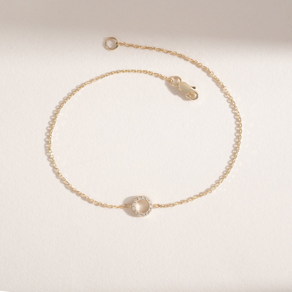 Elevate your wrist with our Circle Diamond Bracelet. Dainty solid gold circle adorned with sparkling pav?-set diamonds.