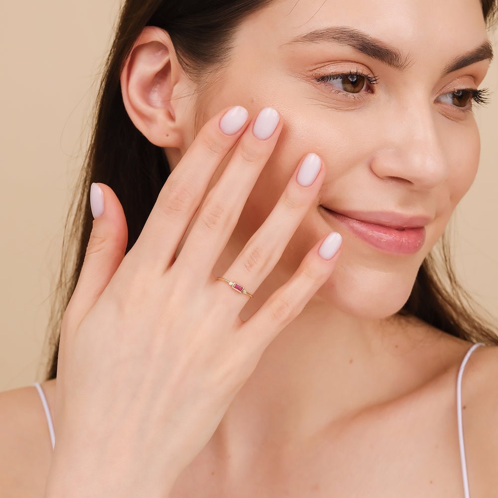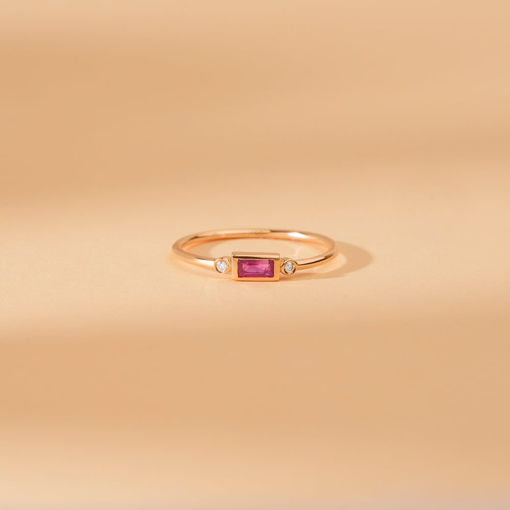 Unveil the enchanting beauty of our 14K Solid Gold Diamond and Baguette Ruby Ring a captivating blend of elegance and allure that embodies the essence of love, prosperity, and sophistication.