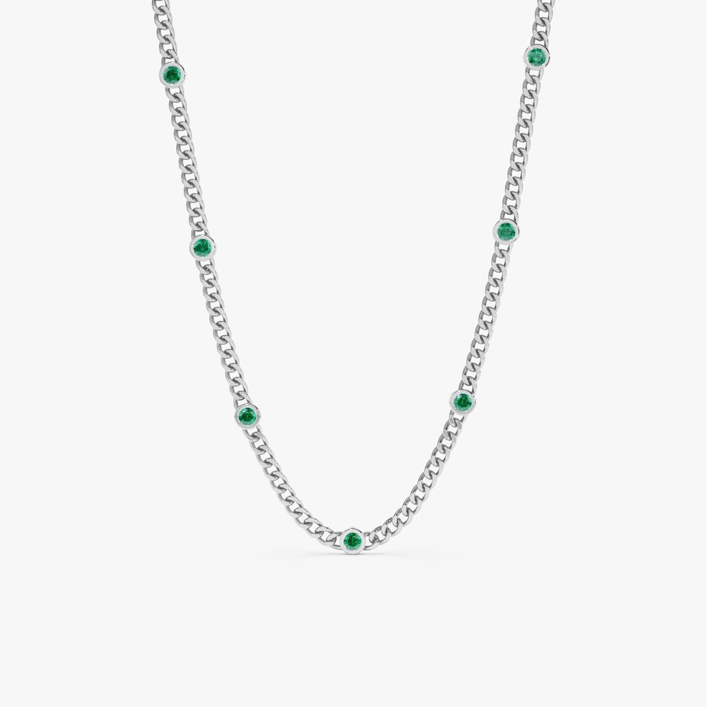 A luxurious 14K solid gold Cuban chain necklace featuring emerald stations, offering a bold and elegant design perfect for any special occasion.