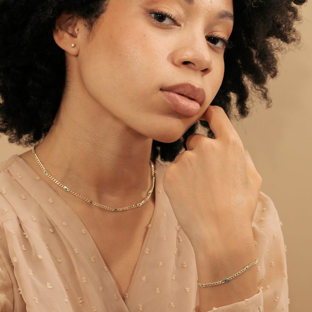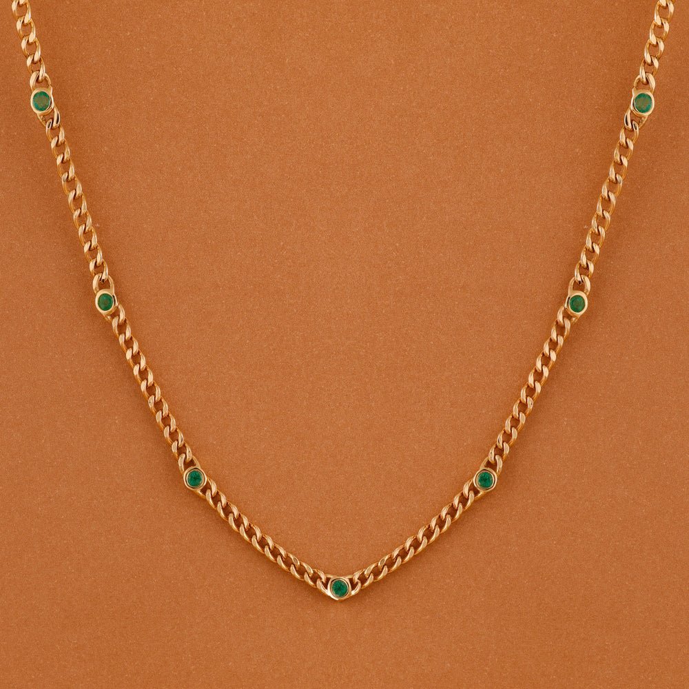 Indulge in the timeless allure of our Emerald Cuban Chain Station Necklace, a stunning piece that reimagines classic luxury with a modern twist. Crafted with meticulous attention to detail, this necklace features vibrant emeralds nestled along a shimmering 14K Solid Gold Cuban chain.