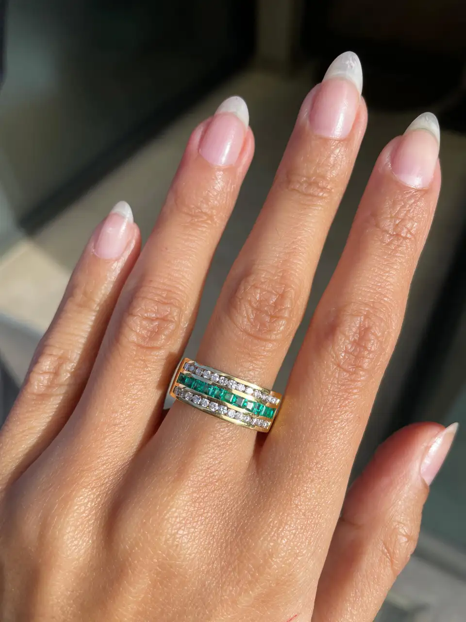 Stunning 14K solid gold half eternity ring with square-cut emeralds, blending classic charm and modern elegance.