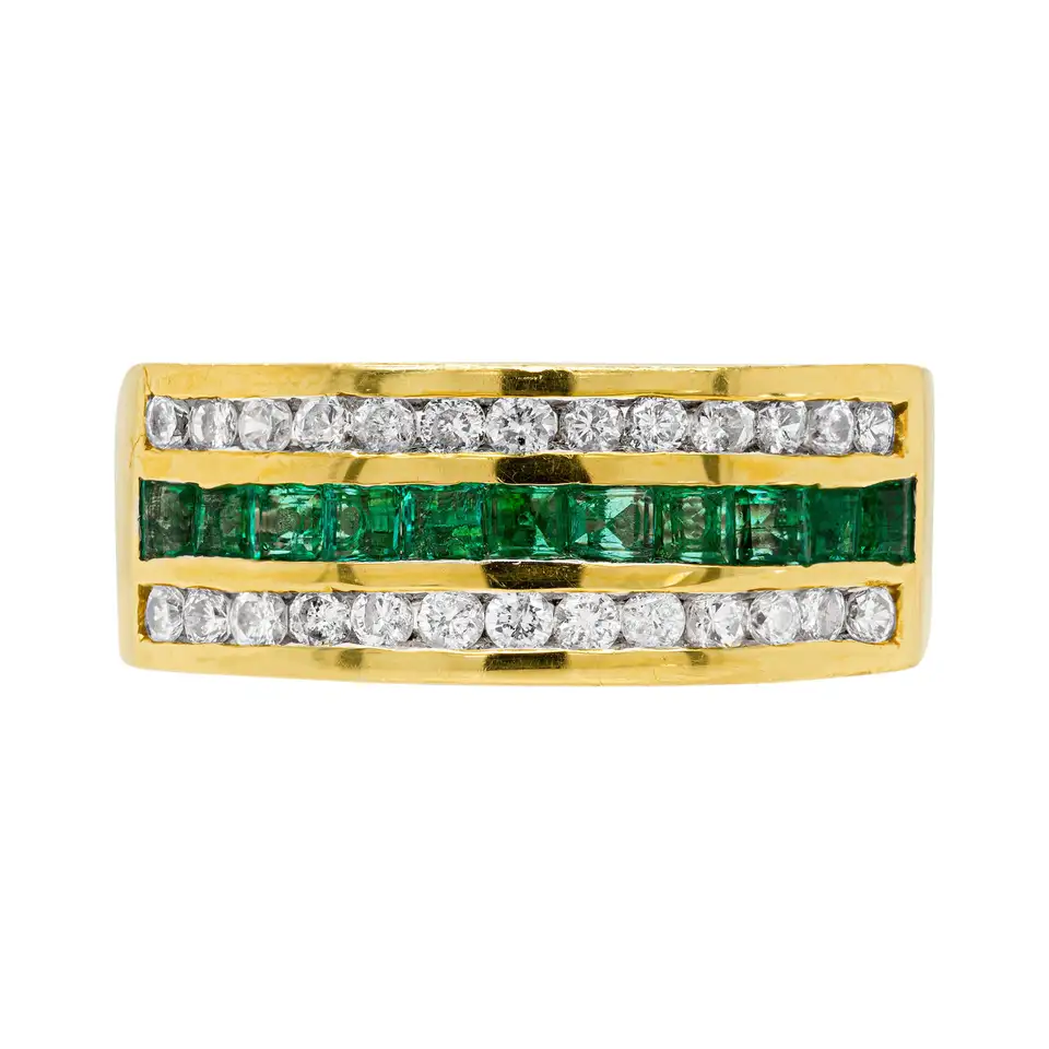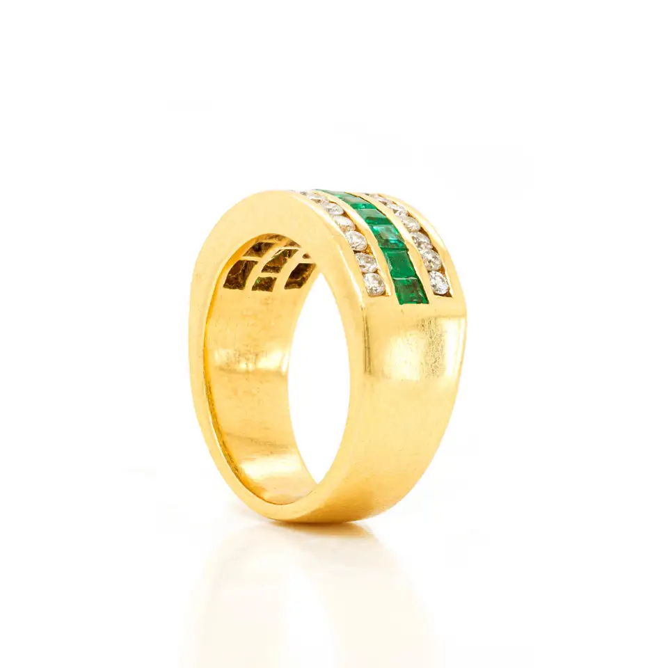 With a design that has been focused on the play of sparkling diamonds and lush green emeralds, it offers vivid contrast and is a versatile piece that can be worn as a wedding or anniversary ring.